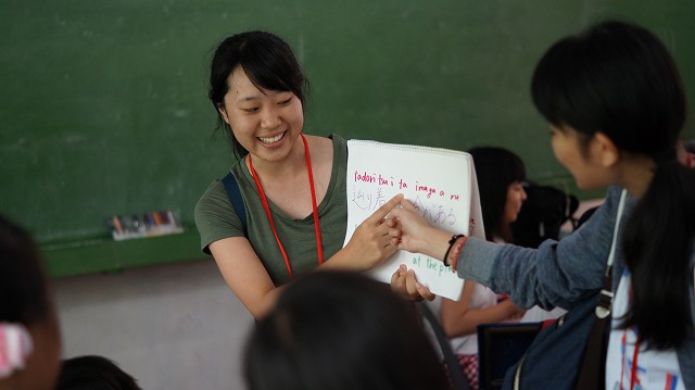 トビタテ留学Japanボランティアに参加している高校生の皆さんが、それぞれ自身の課題活動として用意してきたものを利用して学校で子どもたちに教えています。日本で出発前に準備をすることが大事ですね。デモンストレーション、または子どもたちと一緒に何かを作るにしても、まずは見せてあげること、そして興味をもってもらうことです。